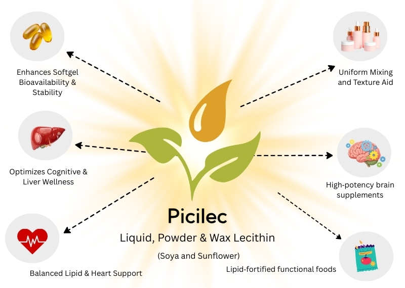With its refined molecular structure, Picilec delivers enhanced bioavailability and superior emulsification, acting as a high-potency vehicle for the absorption of fat-soluble nutrients and active pharmaceutical ingredients. Its high-purity composition ensures excellent formulation stability, ease of processing, and an extended shelf life, making it the reliable choice for manufacturers seeking robust performance in sensitive delivery systems. Whether utilized in high-dose softgels, liposomal formulations, or premium powders, Picilec maintains its integrity, ensuring consistent results from production to consumption.